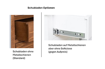 Optional Schubladen auf Metallschienen: Standard Nein (aber gegen Aufpreis erhältlich. Aber ohne Softclose)